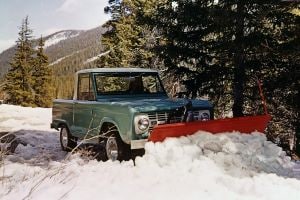 Ford Bronco Pickup in Holly Green with a Wimbledon White roof and snowplow
